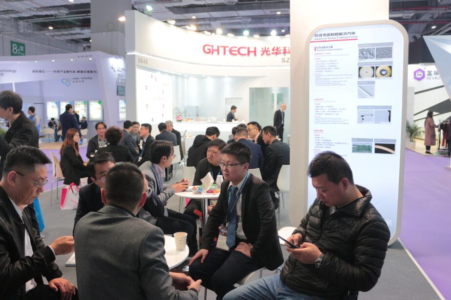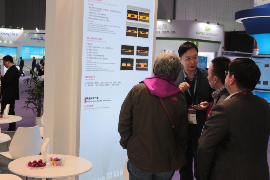 人頭攢動的展會中,光華科技在8.1號館,8K46號展臺迎來了產(chǎn)業(yè)鏈上下游的伙伴們。公司此次特別帶來了面向MSAP制程的專用化學品及5G相關技術,以及其他PCB濕制程化學品的新特性,如超薄面銅填孔,MSAP工藝圖形填孔;耐彎折20次以上的軟板化鎳金;適用于5G信號傳輸?shù)某零y、沉錫產(chǎn)品;以及最新的沉厚金產(chǎn)品。