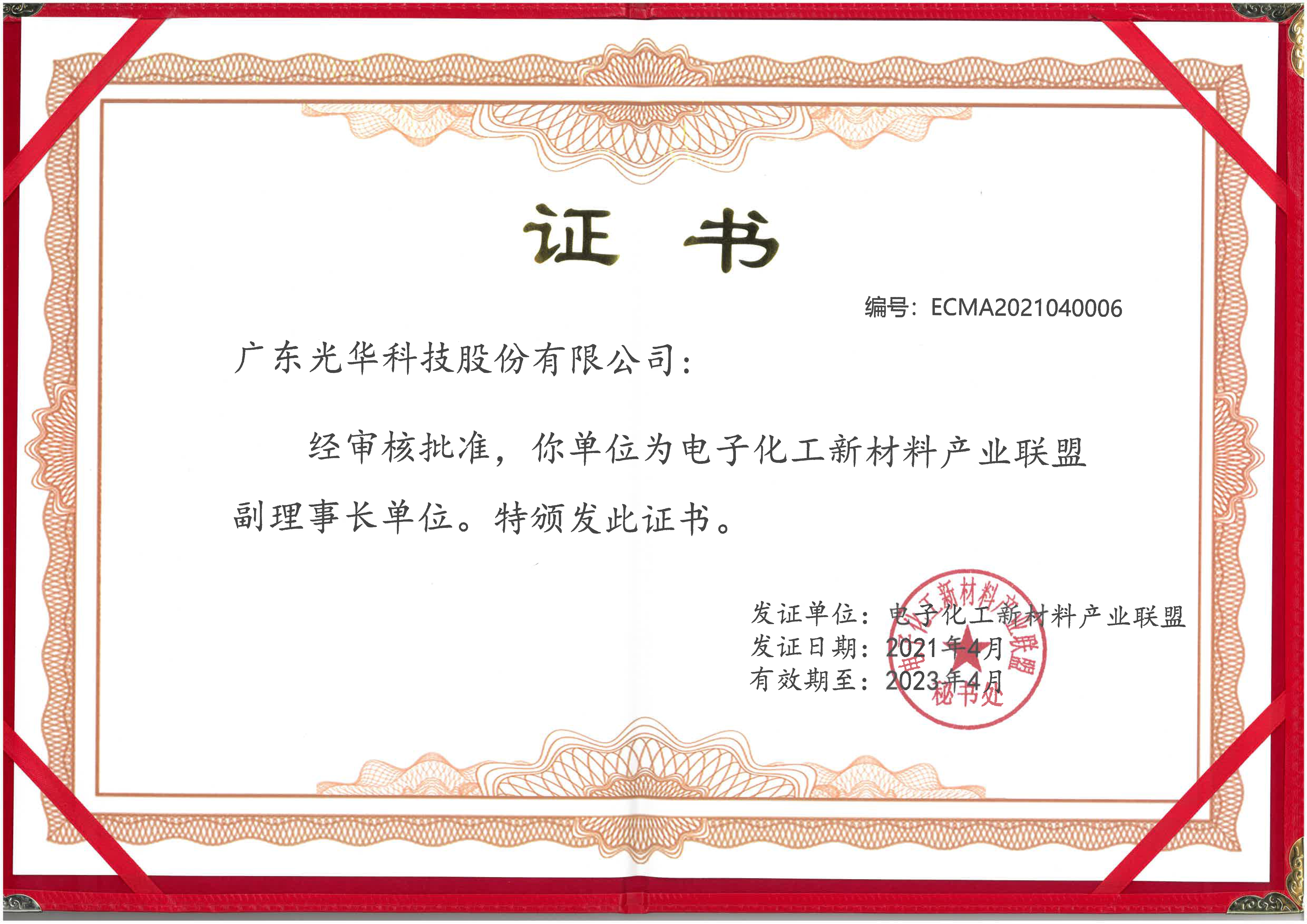 光華科技蟬聯中國電子化工新材料產業聯盟副理事長單位